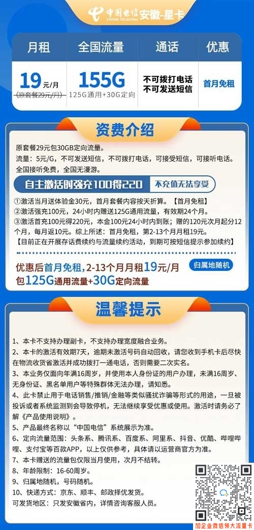 除了上述提到的大流量、首充优惠以及首月免租等显著特点外,安徽电信星卡19元套餐还具备多项优势。比如,其灵活的长期套餐续订机制,允许用户在流量用尽后,无需换卡换号,即可直接在线续订,方便快捷。此外,电信优质的网络信号覆盖与稳定的服务质量,也让用户在享受大流量的同时,保证了上网体验的流畅度和稳定性。